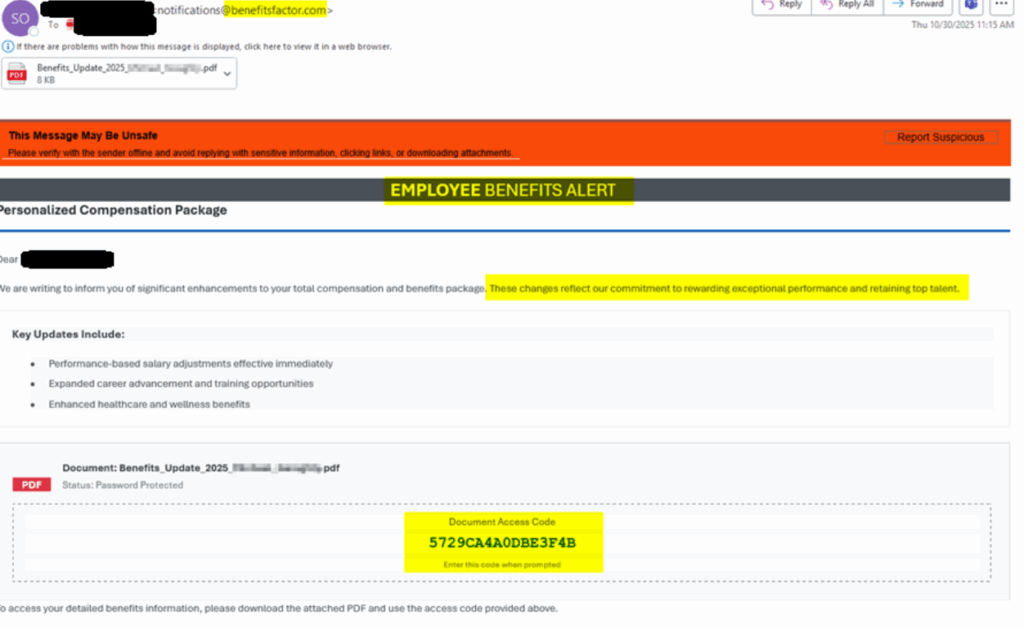 The body of the email references a benefits compensation package with an access code to open the attached document named “Benefits_Update_2025_(recipient).”